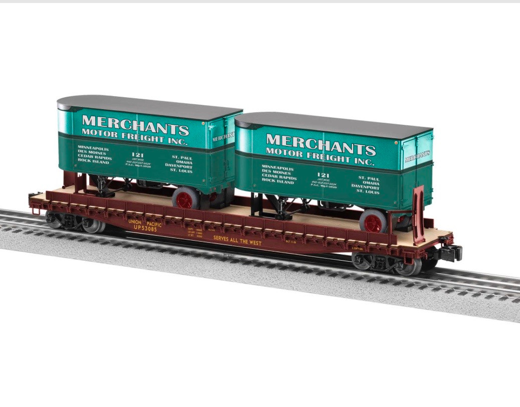 Loading... Please wait...Recreate the early days of intermodal transport with these great flatcars in new paint schemes! Loaded with details, these cars are some of the finest scale freight cars Lionel can produce. FLATCAR: Die-cast body Laser-cut wood deck Die-cast trucks Operating couplers with hidden uncoupling tabs Hinged bridge plates Separately applied handrails and other details TRAILERS:Opening rear doors Plastic bodies Rubber tires--including spare PRODUCT SPECIFICATIONS Rail Line: Union Pacific Road Number: 53085 Gauge: O Gauge Power: Electric Min Curve: O36 Dimensions: Length: 14.75"