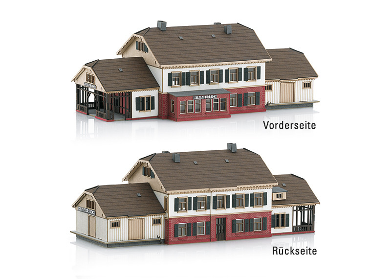 Model: All of the components are made of special high-quality architectural cardstock precision cut with a laser. The masonry is finely engraved. The waiting area includes modelling of the studding. The wooden boarding of the freight shed includes wood engraving. All of the parts already have a realistic basic color. However, they can easily be given additional weathering and paintwork. Dimensions of the finished model approximately: Length 151 mm / 6-15/16", Width 68 mm / 2-11/16", Height 53 mm / 2-1/8".